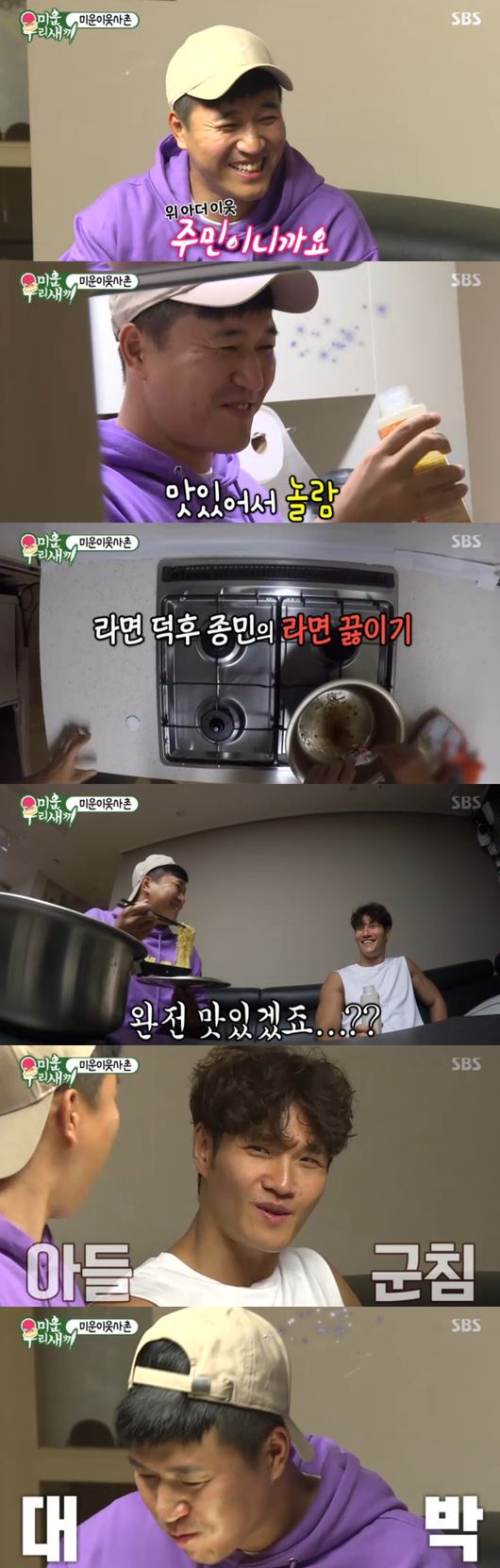 김종국은 집에 찾아온 김종민을 경계했다. 김종민은 "우리 집보다 형 집이 더 편하다"면서 "주민이라 신세지러 왔다"며 천진난만하게 웃었다. 김종민은 "형이 오랜만에 집에서 쉰다"면서 "남의 집 오면서 이렇게 빈손으로 오냐"며 김종민을 황당해했다. 그럼에도 김종민은 "좀 쉬다가겠다"면서 능청, 배고프다면서 직접 라면을 끓여먹겠다고 했다. 야식은 물론, 라면 자체를 잘 먹지 않는 김종국은 "왜 갑자기 우리집에서 라면 먹냐"며 심기불편한 모습을 보였다. 김종민은 "제일 맛있다"며 꿋꿋하게 라면을 끓였다.