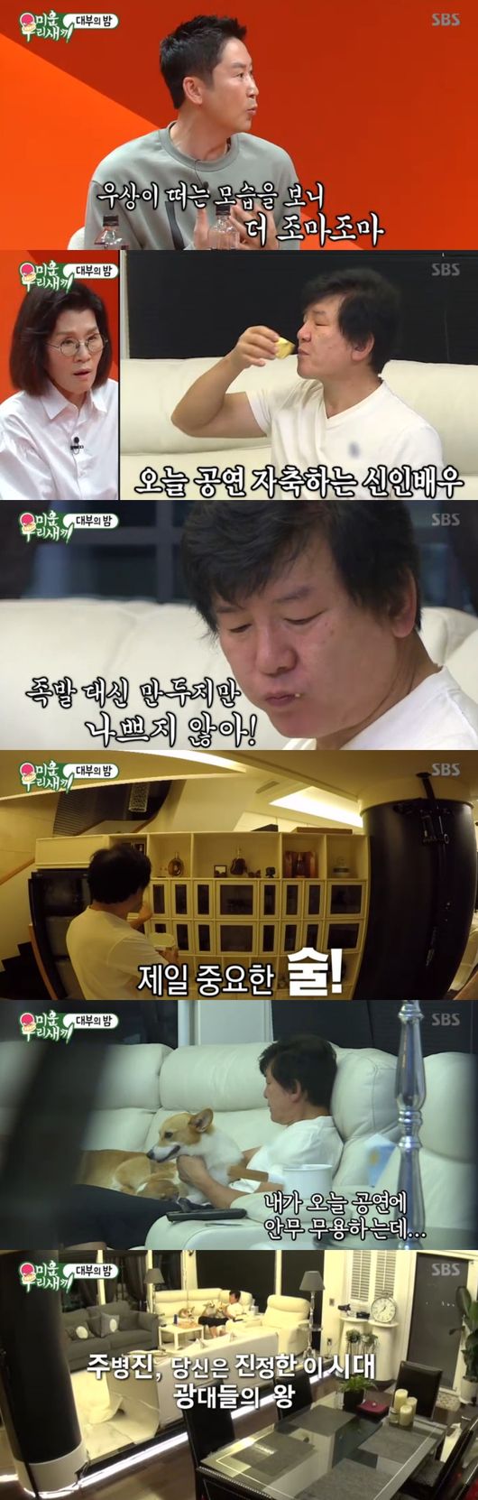 실수없이 멋지게 무대를 내려온 주병진, 공연을 시작하고 이제서야 미소를 지었다. 뮤지컬 무대를 무사히 마친 주병진은 집에 오자마자 허공에 한 잔을 하며 공연자축 겸 술잔을 기울였다. 주병진은 반려견들에게 "안무하는데 박수 많이 받았다, 그래도 양이 안 차더라"면서 "더 잘할 수 잇었는데, 연습이 더 필요하겠다 싶었다"면서 끝나지 않는 열정을 보였다.