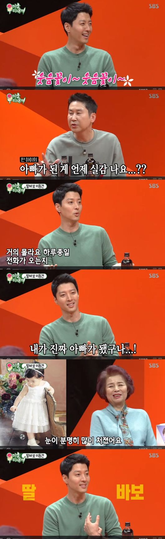 이날 신동엽은 이동건에게 언제 아빠가 된 것이 가장 실감나냐고 물었다. 이에 이동건은 "사실 촬영 현장에 휴대폰을 가져가지도 않았다. 전화온지도 모르는 편"이라면서 "요즘엔 쉬는시간마다 전화기보고 영상통화한다. 전화가 안 되면 사진이라도 본다. 그 때 내가 진짜 아빠가 됐다고 느낀다"면서 관심사가 온통 아기에게 집중됐다고 했다.