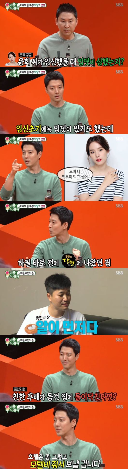신동엽은 임신했을 때 아내 조윤희의 입덧이 있었는지 문득 궁금해했다. 이동건은 "거의 없었다"면서 "초기엔 있었지만 나중엔 뭐든지 잘 먹었다, 놀랄만큼 많이 먹었다"고 했다. 특히 하필 달인프로에 나온 떡볶이집 한시간 이상 줄서서 떡볶이 사다준 것 생각난다고 했고, 母들은 "자상한 남편이다"며 부러워했다.