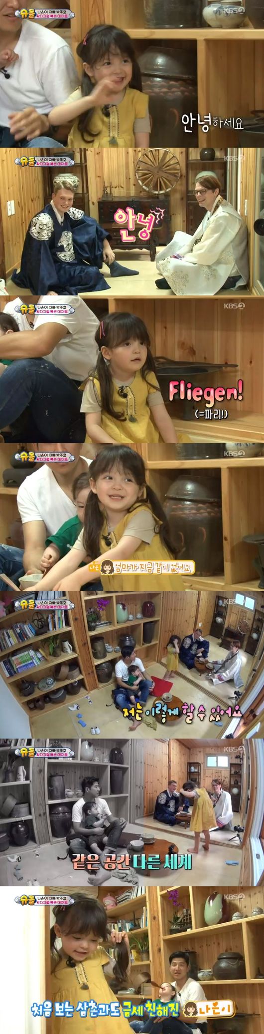특히 전통찻집에서는 독일인 관광객을 만난 나은이 그들과 독일어로 술술 의사소통을 하는 모습으로 모두를 놀라게 했다. 박주호와 건후가 소외됐을 정도. 관광객들은 엄마가 독일 사람이냐고 물었고, 도경완과 장윤정도 내레이션을 통해 "아예 대화가 된다"며 놀라워했다.