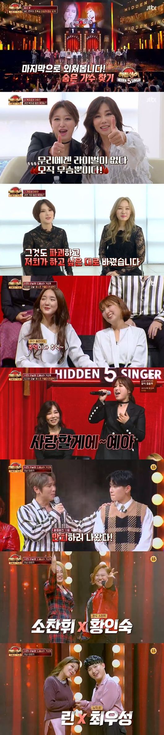지난 7일 오후 방송된 JTBC 예능 프로그램 '히든싱어5'에서는 '도플싱어 가요제' 2탄이 그려졌다. '도플싱어 가요제' 2탄에는 김경호X곽동현, 거미X이은아, 소찬휘X황인숙, 박현빈X김재현, 케이윌X정한, 박미경X이효진, 바다X최소현, 린X최우성X안민희가 참석했다.