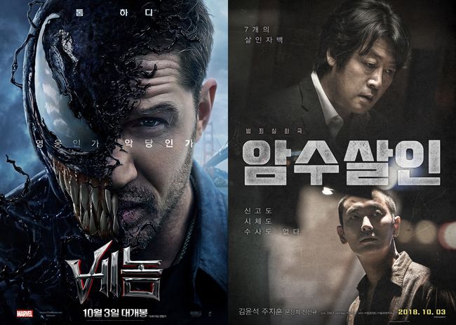 영화 '베놈'이 개봉 한글날 연휴에 박스오피스 1위를 차지했다. '암수살인'이 2위를 차지하면서 200만을 넘어섰다.