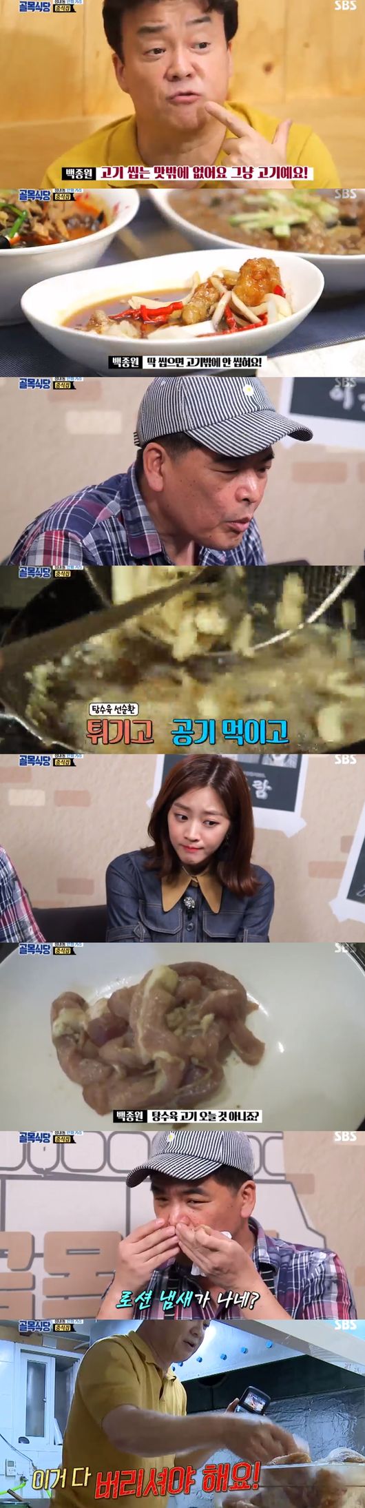 탕수육 고기를 본 백종원은 "이거 오늘 거 아니죠?"라고 물었다. 이어 "돼지고기 색이 이렇게 다를 정도면 되게 위험한 상태"라며 "다 버리셔야한다"고 전했다.