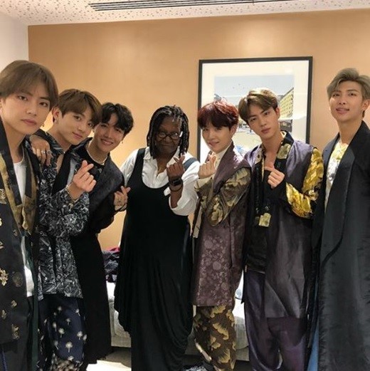 12일 방탄소년단은 공식 SNS를 통해 "우리가 우피 골드버그를 만났다"라는 설명과 함께 사진을 공개했다. 사진 속 방탄소년단은 우피 골드버그와 함께 손하트를 만들며 카메라를 바라보고 있다.