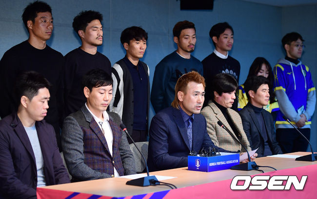12일 한국과 우루과이 평가전이 열리는 전 서울월드컵경기장에서는 '아산무궁화 선수수급 중단 사태 해결 촉구' 성명서를 낭독하는 자리가 마련됐다.