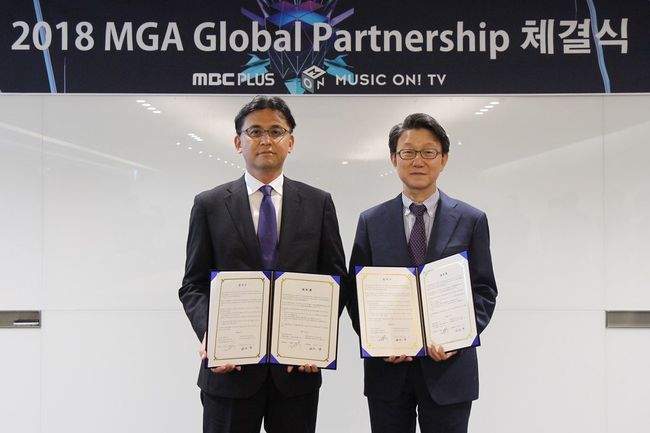 MBC플러스(MBC PLUS)와 엠온 엔터테인먼트는 지난 12일 양사 대표 참석 하에 ‘2018 MGA(MBC플러스 X 지니뮤직 어워드)’ 글로벌 파트너십 체결식을 진행했다.