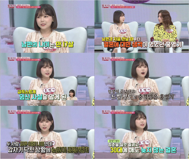 홍영기는 이날 오후 11시 방송되는 MBN ‘동치미’에 출연한다. 녹화 당시 홍영기는 “만 17살 고등학생 남편과 결혼했다”며 “남편과 결혼을 결심하고 만났지만 아이는 예상하지 못했다”고 밝혔다.