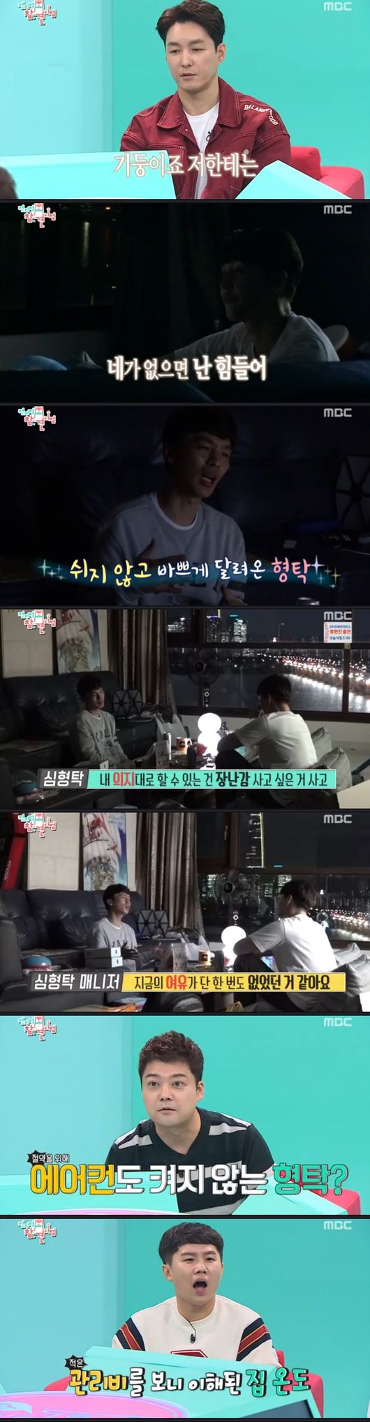 다음은 심형탁과 황원택 매니저의 일상이 그려졌다. 심형탁은 매니저가 기다리는 집에 한 아름 장을 봐서 들어갔다. 매니저는 "우린 주로 집에서 만난다"고 했다. 작은 돈으로 편안하게 집에서만 만난다고. 절약정신이 투철한 심형탁은 어두컴컴한 거실에서 매니저와 대면, 이내 사온 선물들을 꺼냈다.