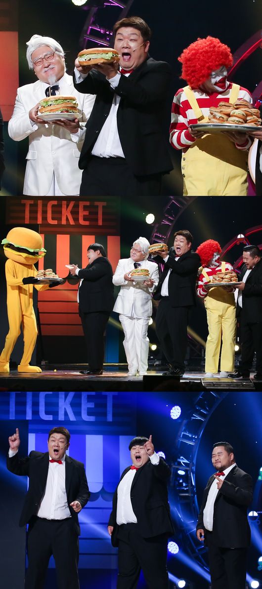 녹화 당일 여느 때처럼 가사와 먹방을 연결 지으며 유쾌한 노래 개그로 관객들을 포복절도케 한 이들은 ‘행복을 주는 사람’을 부르다 나타난 유명 프랜차이즈 광고 캐릭터들과 햄버거에 반색하며 온 몸으로 신남을 표현했다.