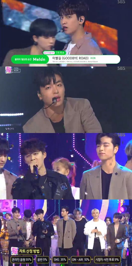 14일 오후 생방송으로 진행된 SBS '인기가요'에서 아이콘이 '이별길'로 10월 둘째 주 1위에 올랐다. '하루도 그대를 사랑하지 않은 적이 없었다'의 임창정, '사이렌'의 선미를 꺾고 음악 방송 5관왕에 성공했다. 아이콘은 YG 식구들과 아이코닉 팬들에게 고마운 마음을 전했다.