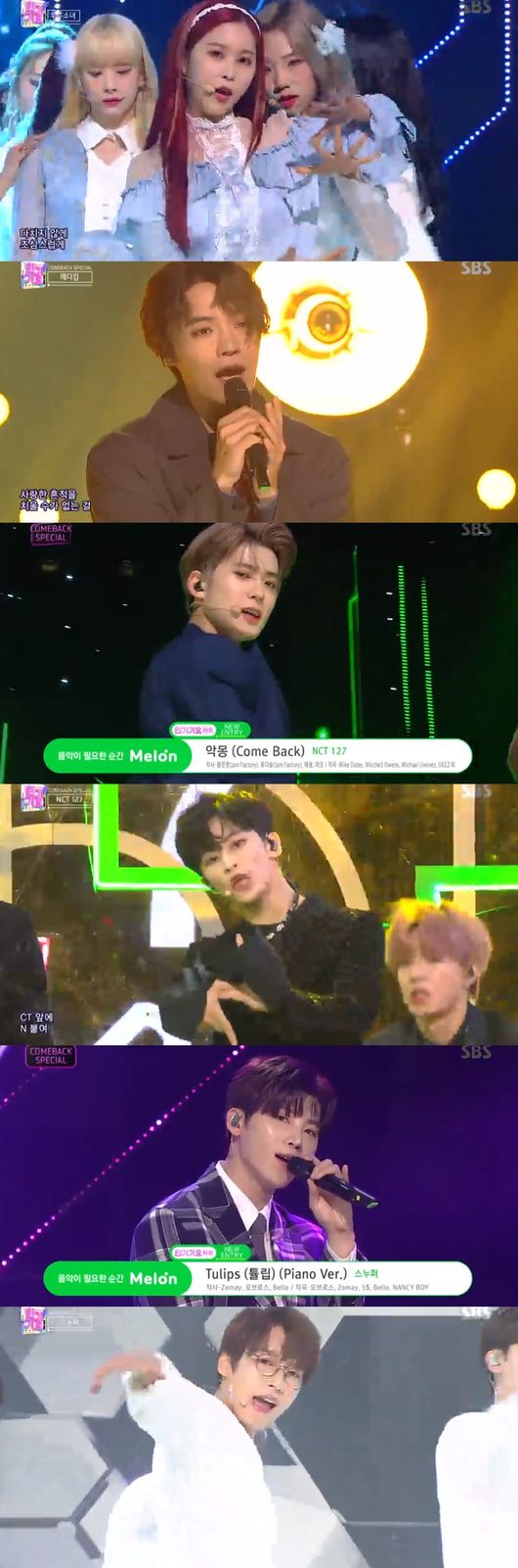 위키미키도 신곡을 들고 돌아왔다. '트루 밸런타인'으로 컴백 스페셜 무대 포문을 열었고 타이틀곡 '크러시'로 걸크러시의 진수를 뽐냈다. 특히 영화 '레옹'의 마틸다처럼 변신한 최유정의 비주얼이 오빠 팬들을 짜릿하게 만들었다.