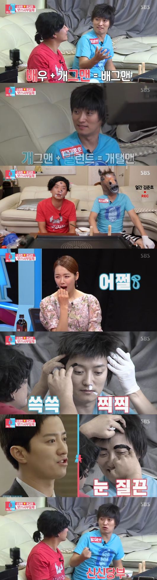 드디어 먹방을 시작, 이어 성대모사부터 콩트가 시작됐다. 안절부절하던 인교진은 갑자기 방송 중 화장실을 가고싶다고 호소, 마침 인교진이 자리를 비운 사이, 김준호는 호떡에 겨자를 넣어 눈속임 장난을 시작했다.
