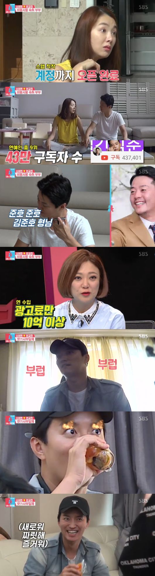 이날 소이현과 인교진 부부의 일상이 그려졌다. 인교진은 "김준호 형 만나러 갈 것"이라면서 요즘 1인 크리에이터 대세임을 이현에게 전했다. 이어 김준호가 연예인 중 9위로 구독자가 43만이라고. 인교진은 "1년 전 준호형이 자기만의 콘텐츠 있으라고 말했다, 선구자 형"이라면서 이를 따라 계정까지 완료했다고 했다. 하지만 아직 구독자는 3명이라고. 인교진은 "비결이 절실하다"면서 화려한 인맥과 B급 정서로 마니아를 거느리는 43만 대부에게 견학을 요청했다.