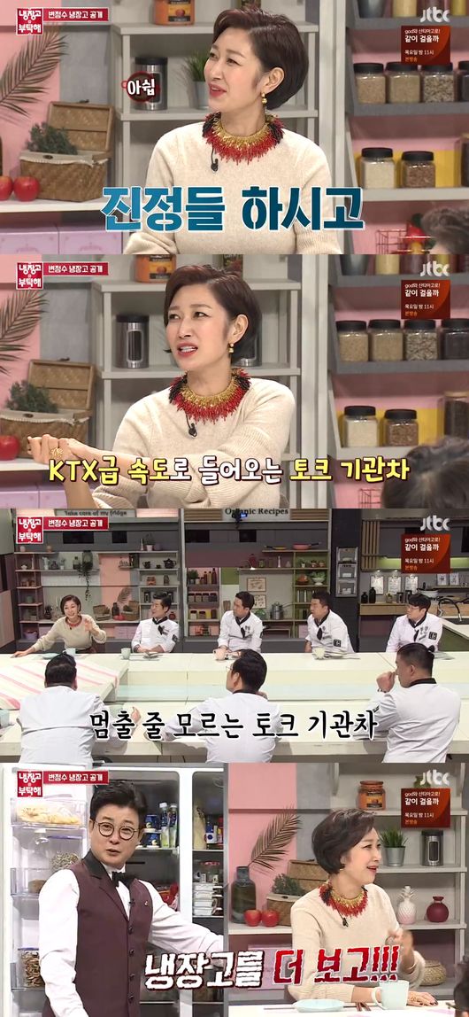 변정수의 ‘토크 폭주’는 좀처럼 멈추지 않았다. 하나의 주제가 시작되면 변정수는 MC들의 도움 없이도 자신의 이야기를 늘어놨다. 변정수의 언변에 셰프들도 빠져 들었고, ‘국민 MC’ 김성주 조차도 변정수의 토크에 끼어들 틈이 없었다. 빨리 냉장고를 소개해야 하는 김성주와 안정환은 변정수의 쉴 새 없는 토크에 당황했고, 중간중간 원치 않게 브레이크까지 걸어야만 했다.