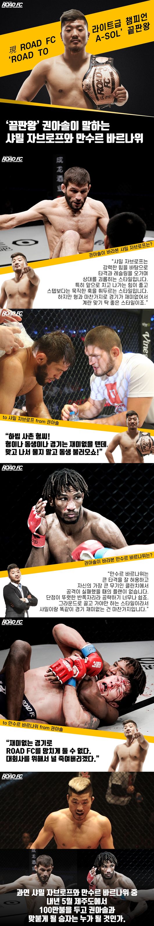 ROAD FC(로드FC) ‘라이트급 챔피언’ 권아솔(32, 팀 코리아 MMA)의 복귀전이자 ‘ROAD TO A-SOL’ 100만 달러 토너먼트의 마지막이 될 경기가 다가오고 있다.