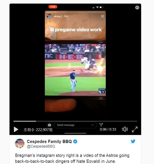 휴스턴과 보스턴이 17일(이하 한국시간) 열리는 아메리칸리그 챔피언십시리즈 3차전을 앞두고 '동영상'으로 신경전을 주고 받아 화제다. 휴스턴의 알렉스 브레그먼은 보스턴의 3차전 선발 네이선 이오발디를 자극하는 동영상을 SNS에 올렸고, 양 팀 선수단에 화제가 됐다.