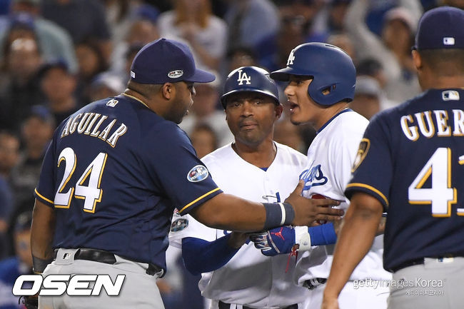 LA 다저스 매니 마차도, 밀워키 브루어스의 헤수스 아길라가 팽팽한 승부를 대변하듯 충돌 이후 팽팽한 신경전을 벌였다.
