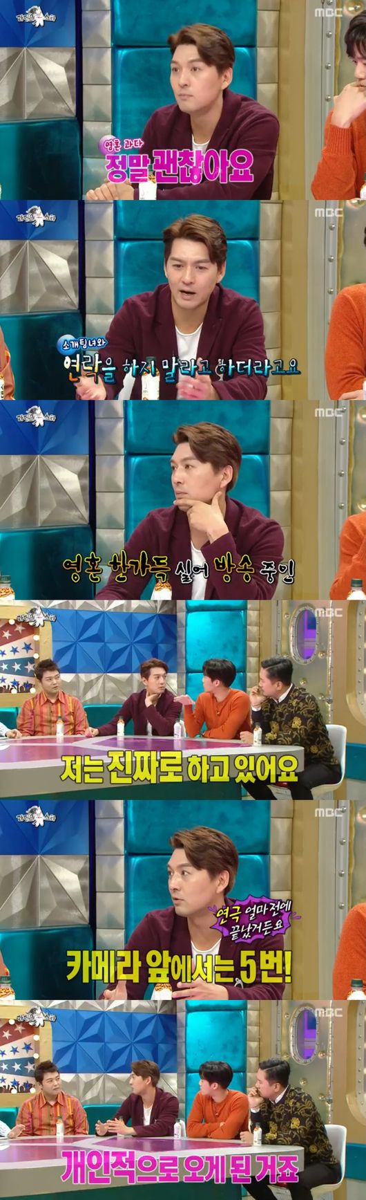 이필모는 "첫 출연"이라면서 수줍게 자신을 소개했다. 이어 연애하는 프로 불만이라고. 이필모는 "첫번째 만난 분과 실패했으나 지금은 좋다"면서 진지하게 생각하냐는 질문에 "살짝 마음 있다, 정말 괜찮은 사람"이라며 솔직한 마음을 전했다.