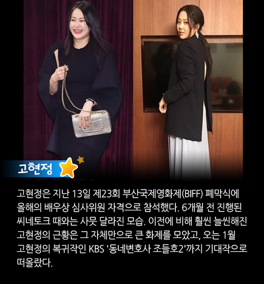 고현정은 지난 13일 제23회 부산국제영화제(BIFF) 폐막식에 올해의 배우상 심사위원 자격으로 참석했다. 6개월 전 진행된 씨네토크 때와는 사뭇 달라진 모습. 이전에 비해 훨씬 늘씬해진 고현정의 근황은 그 자체만으로 큰 화제를 모았고, 오는 1월 고현정의 복귀작인 KBS '동네변호사 조들호2'까지 기대작으로 떠올랐다.