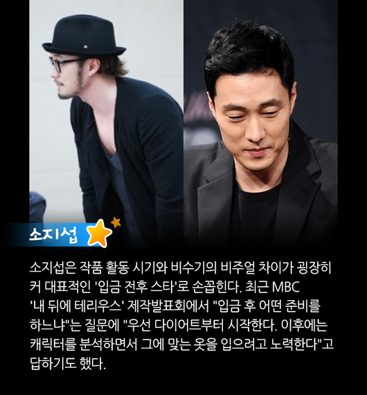 소지섭은 작품 활동 시기와 비수기의 비주얼 차이가 굉장히 커 대표적인 '입금 전후 스타'로 손꼽힌다. "출연료 입금 전후 사진을 가끔 찾아본다. 재밌다"고 말한 바 있는 소지섭은 최근 MBC '내 뒤에 테리우스' 제작발표회에서 "입금 후 어떤 준비를 하느냐"는 질문에 "우선 다이어트부터 시작한다. 이후에는 캐릭터를 분석하면서 그에 맞는 옷을 입으려고 노력한다"고 답하기도 했다.