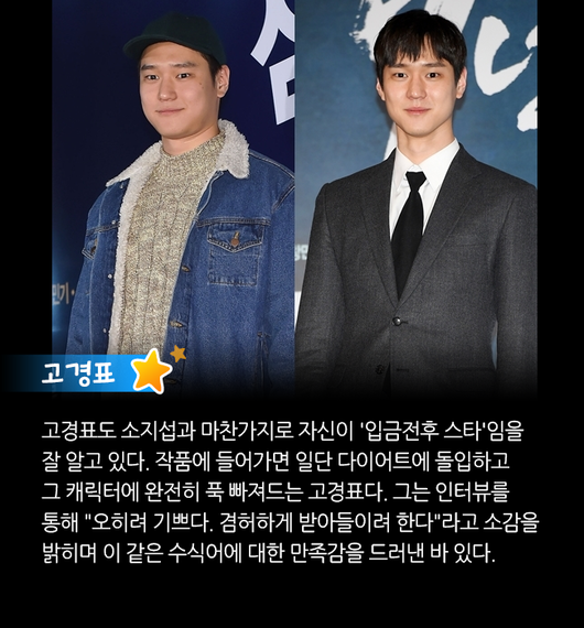 고경표도 소지섭과 마찬가지로 자신이 '입금전후 스타'임을 잘 알고 있다. 작품에 들어가면 일단 다이어트에 돌입하고 그 캐릭터에 완전히 푹 빠져드는 고경표다. 그는 인터뷰를 통해 "오히려 기쁘다. 겸허하게 받아들이려 한다"라고 소감을 밝히며 이 같은 수식어에 대한 만족감을 드러낸 바 있다.