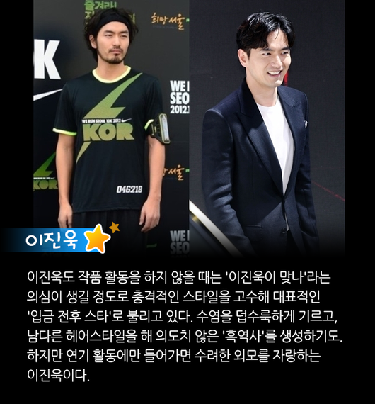 이진욱도 작품 활동을 하지 않을 때는 '이진욱이 맞나'라는 의심이 생길 정도로 충격적인 스타일을 고수해 대표적인 '입금 전후 스타'로 불리고 있다. 수염을 덥수룩하게 기르고, 남다른 헤어스타일을 해 의도치 않은 '흑역사'를 생성하기도. 하지만 연기 활동에만 들어가면 수려한 외모를 자랑하는 이진욱이다.