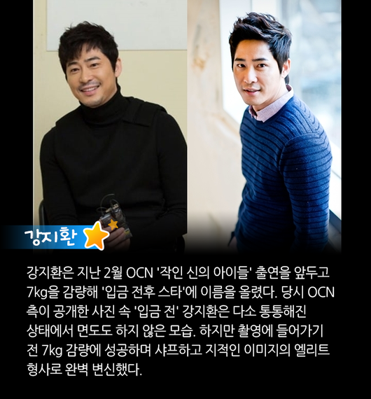 강지환은 지난 2월 OCN '작인 신의 아이들' 출연을 앞두고 7kg을 감량해 '입금 전후 스타'에 이름을 올렸다. 당시 OCN 측이 공개한 사진 속 '입금 전' 강지환은 다소 통통해진 상태에서 면도도 하지 않은 모습. 하지만 촬영에 들어가기 전 7kg 감량에 성공하며 샤프하고 지적인 이미지의 엘리트 형사로 완벽 변신했다.