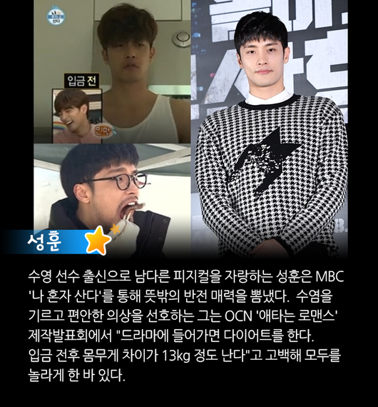 수영 선수 출신으로 남다른 피지컬을 자랑하는 성훈은 MBC '나 혼자 산다'를 통해 뜻밖의 반전 매력을 뽐냈다. 수염을 기르고 편안한 의상을 선호하는 그는 OCN '애타는 로맨스' 제작발표회에서 "드라마에 들어가면 다이어트를 한다. 입금 전후 몸무게 차이가 13kg 정도 난다"고 고백해 모두를 놀라게 한 바 있다.