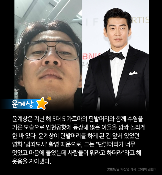 윤계상은 지난 해 5대 5 가르마의 단발머리와 함께 수염을 기른 모습으로 인천공항에 등장해 많은 이들을 깜짝 놀라게 한 바 있다. 윤계상이 단발머리를 하게 된 건 앞서 있었던 영화 '범죄도시' 촬영 때문으로, 그는 "단발머리가 너무 멋있고 마음에 들었는데 사람들이 뭐라고 하더라"라고 해 웃음을 자아냈다. /parkjy@osen.co.kr