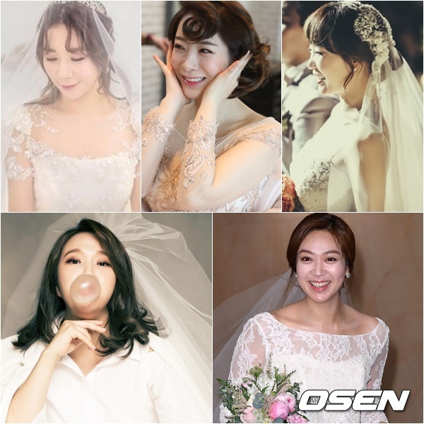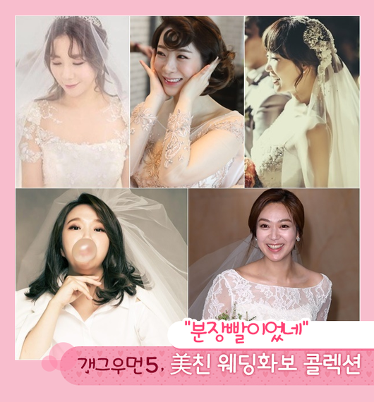 평소엔 미녀 개그우먼으로 불리진 않았지만 웨딩드레스를 입은 그들은 역시나 여신다웠다. 많은 이들을 웃기려고 일부러 망가졌지만 개그우먼들도 한껏 꾸미니 아름다웠다. 분장에 숨겨졌던 미모를 웨딩화보에서 발산한 홍현희, 안소미, 정주리, 이은형, 허안나다.