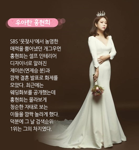 SBS '웃찾사'에서 농염한 매력을 뿜어냈던 개그우먼 홍현희는 셀프 인테리어 디자이너로 알려진 제이쓴(연제승 분)과 깜짝 결혼 발표로 화제를 모았다. 최근에는 웨딩화보를 공개했는데 홍현희는 몰라보게 청순한 자태로 보는 이들을 깜짝 놀라게 했다. 덕분에 그 날 검색순위 1위는 그의 차지였다.