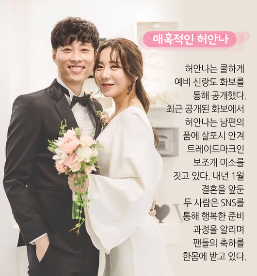 허안나는 쿨하게 예비 신랑도 화보를 통해 공개했다. 최근 공개된 화보에서 허안나는 남편의 품에 살포시 안겨 트레이드마크인 보조개 미소를 짓고 있다. 내년 1월 결혼을 앞둔 두 사람은 SNS를 통해 행복한 준비 과정을 알리며 팬들의 축하를 한몸에 받고 있다.