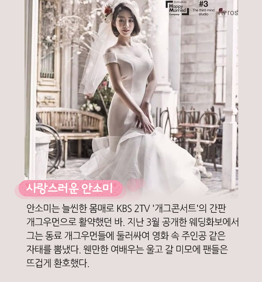안소미는 늘씬한 몸매로 KBS 2TV '개그콘서트'의 간판 개그우먼으로 활약했던 바. 지난 3월 공개한 웨딩화보에서 그는 동료 개그우먼들에 둘러싸여 영화 속 주인공 같은 자태를 뽐냈다. 웬만한 여배우는 울고 갈 미모에 팬들은 뜨겁게 환호했다.
