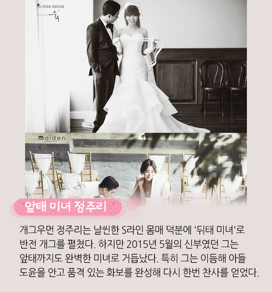 개그우먼 정주리는 날씬한 S라인 몸매 덕분에 '뒤태 미녀'로 반전 개그를 펼쳤다. 하지만 2015년 5월의 신부였던 그는 앞태까지도 완벽한 미녀로 거듭났다. 특히 그는 이듬해 아들 도윤을 안고 품격 있는 화보를 완성해 다시 한번 찬사를 얻었다.