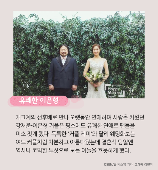 개그계의 선후배로 만나 오랫동안 연애하며 사랑을 키웠던 강재준-이은형 커플은 평소에도 유쾌한 연애로 팬들을 미소 짓게 했다. 독특한 '커플 케미'와 달리 웨딩화보는 여느 커플처럼 차분하고 아름다웠는데 결혼식 당일엔 역시나 코믹한 투샷으로 보는 이들을 흐뭇하게 했다.