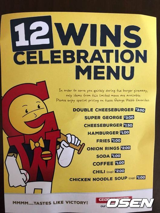 정규시즌을 8연승으로 마친 밀워키는 디비전시리즈 3연승과 챔피언십시리즈 1차전 승리로 12연승을 달성했다. 특히 클레이튼 커쇼를 3이닝 6피안타 2볼넷 1피홈런 5실점으로 두드리고 거둔 12연승이라 더욱 맛이 짜릿했다. 경기 후 ‘조지 웹’은 자사홈페이지를 통해 “18일 오후 2시부터 6시(현지시간)까지 약속대로 공짜버거를 대접하겠다”고 발표했다.