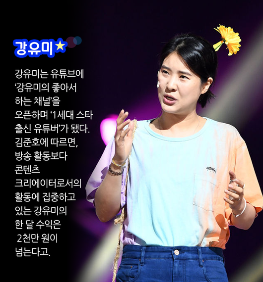 강유미는 유튜브에 ‘강유미의 좋아서 하는 채널’을 오픈하며 ‘1세대 스타 출신 유튜버’가 됐다. 김준호에 따르면, 방송 활동보다 콘텐츠 크리에이터로서의 활동에 집중하고 있는 강유미의 한 달 수익은 2천만 원이 넘는다고. 강유미는 KBS 2TV ‘해피투게더’에 출연했을 때 자신의 수익에 대해 “월수입은 외제차 중형차 가격 정도 된다”고 밝혀 화제를 모았다.