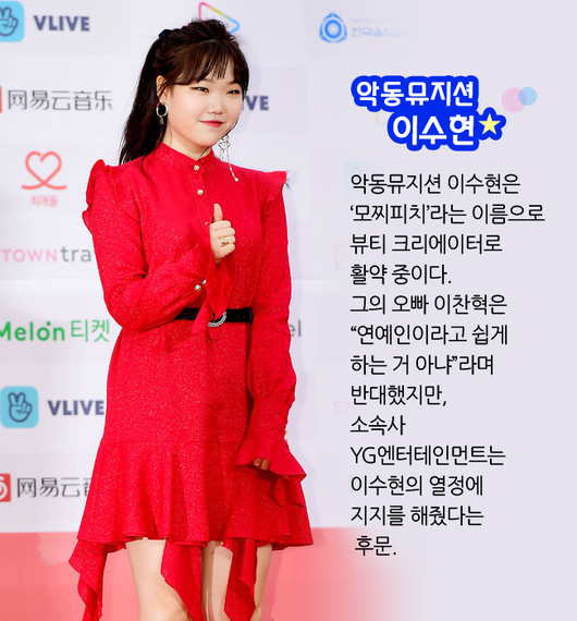 악동뮤지션 이수현은 ‘모찌피치’라는 이름으로 뷰티 크리에이터로 활약 중이다. 그의 오빠 이찬혁은 “연예인이라고 쉽게 하는 거 아냐”라며 반대했지만, 소속사 YG엔터테인먼트는 이수현의 열정에 지지를 해줬다는 후문. 이수현은 “프로페셔널하게 할 수는 없지만 열심히 하다보면 나를 좋아해주시지 않을까라고 생각했다”며 ‘뷰튜버’로서의 열정을 드러냈다.