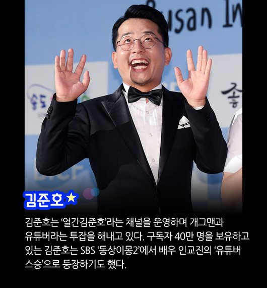 김준호는 ‘얼간김준호’라는 채널을 운영하며 개그맨과 유튜버라는 투잡을 해내고 있다. 구독자 40만 명을 보유하고 있는 김준호는 SBS ‘동상이몽2’에서 배우 인교진의 ‘유튜버 스승’으로 등장하기도 했다. 그는 OSEN과의 인터뷰에서 “유튜브로 100만 구독자까지 가면 얼마나 수익을 낼 수 있는지 통계를 내서 후배들에 공개하고 싶다”며 개그맨 후배들에게 새로운 길을 열어주고 싶다는 포부를 드러낸 바 있다.