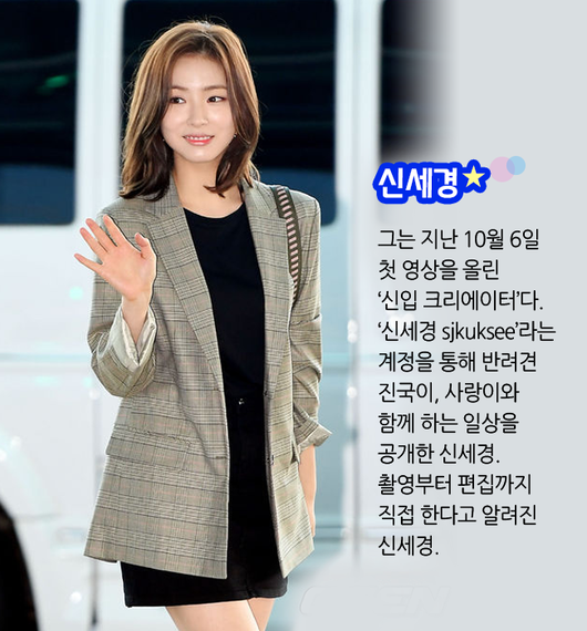 그는 지난 10월 6일 첫 영상을 올린 ‘신입 크리에이터’다. ‘신세경 sjkuksee’라는 계정을 통해 반려견 진국이, 사랑이와 함께 하는 일상을 공개한 신세경. 촬영부터 편집까지 직접 한다고 알려진 신세경. 자연스러운 일상 기록 영상에서도 빛나는 외모를 자랑해 시청자들로부터 “골목상권에 침투한 대기업”이란 농담 섞인 댓글을 얻기도 했다.
