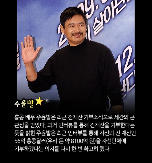 홍콩 배우 주윤발은 최근 전재산 기부소식으로 세간의 큰 관심을 받았다. 과거 인터뷰를 통해 전재산을 기부한다는 뜻을 밝힌 주윤발은 최근 인터뷰를 통해 자신의 전 재산인 56억 홍콩달러(우리 돈 약 8100억 원)을 자선단체에 기부하겠다는 의지를 다시 한 번 확고히 했다.
