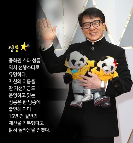 중화권 스타 성룡 역시 선행스타로 유명하다. 자신의 이름을 딴 자선기금도 운영하고 있는 성룡은 한 방송에 출연해 이미 15년 전 절반의 재산을 기부했다고 밝혀 놀라움을 전했다. 그는 “사실 전 재산의 반을 이미 15년 전 기금회에 기부한 상태다. 저는 죽을 때 통장잔고가 0이어야 한다고 생각한다. 최선을 다해 영화를 찍어서 돈을 열심히 번 후, 그것을 사회에 모두 환원할 생각”이라고 전했다.