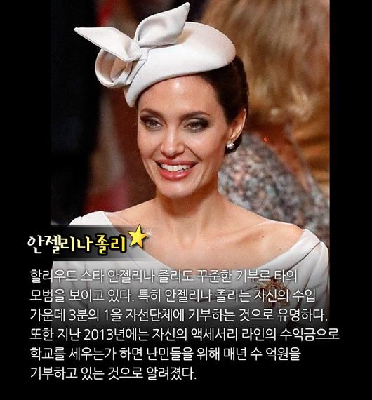 할리우드 스타 안젤리나 졸리도 꾸준한 기부로 타의 모범을 보이고 있다. 특히 안젤리나 졸리는 자신의 수입 가운데 3분의 1을 자선단체에 기부하는 것으로 유명하다. 또한 지난 2013년에는 자신의 액세서리 라인의 수익금으로 학교를 세우는가 하면 난민들을 위해 매년 수 억원을 기부하고 있는 것으로 알려졌다.