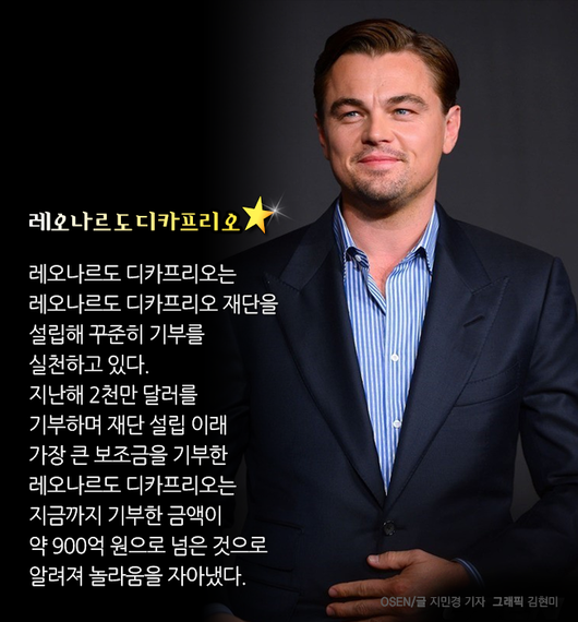 할리우드 배우이자 환경운동가로 활동중인 레오나르도 디카프리오는 레오나르도 디카프리오 재단을 설립해 꾸준히 기부를 실천하고 있다. 지난해 2천만 달러를 기부하며 재단 설립 이래 가장 큰 보조금을 기부한 레오나르도 디카프리오는 지금까지 기부한 금액이 약 900억 원으로 넘은 것으로 알려져 놀라움을 자아냈다. /mk3244@osen.co.kr