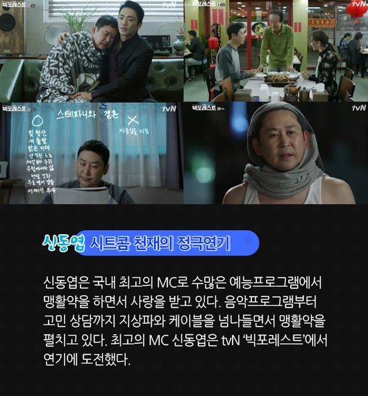 최고의 MC 신동엽은 tvN ‘빅포레스트’에서 연기에 도전했다. 전설적인 예능프로그램 SBS ‘헤이헤이헤이’에서 탁월한 연기로 명성을 날렸던 그는 ‘빅포레스트’에서 한층 더 발전한 연기로 배우 못지 않은 포스를 뿜어내고 있다. 신동엽은 ‘빅포레스트’에서 사채업자에게 빚을 지고 시달리는 연예인 신동엽으로 변신해서 특유의 능청스러움과 재치 그리고 진지한 연기력을 동시에 선보였다. 코미디와 정극을 오가는 그는 뛰어난 배우다.
