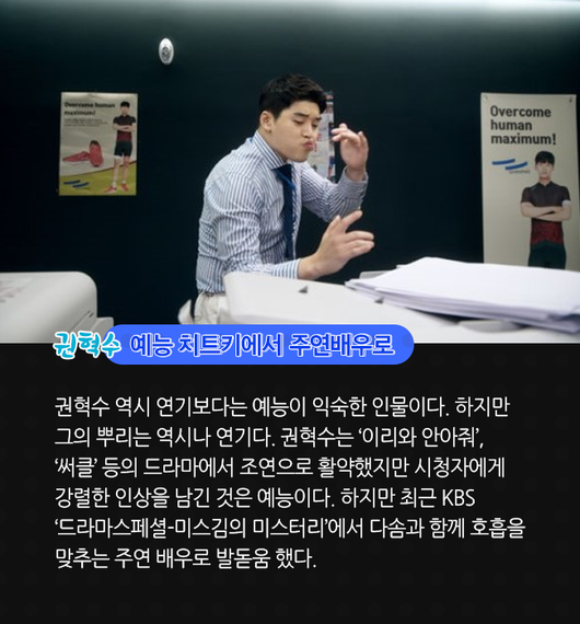 권혁수 역시 연기보다는 예능이 익숙한 인물이다. 하지만 그의 뿌리는 역시나 연기다. 권혁수는 ‘이리와 안아줘’, ‘써클’ 등의 드라마에서 조연으로 활약했지만 시청자에게 강렬한 인상을 남긴 것은 예능이다. 하지만 최근 KBS ‘드라마스페셜-미스김의 미스터리’에서 다솜과 함께 호흡을 맞추는 주연 배우로 발돋움 했다. 지난 12일 방송된 ‘미스김의 미스터리’에서 때론 웃기지만 진솔한 연기를 보여주면서 역시 배우라는 것을 보여줬다.