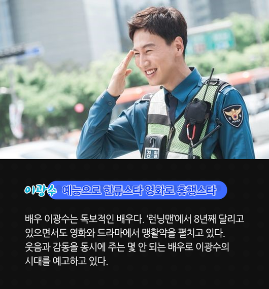 배우 이광수는 독보적인 배우다. ‘런닝맨’에서 8년째 달리고 있으면서도 영화와 드라마에서 맹활약을 펼치고 있다. 2018년 개봉한 영화 ‘탐정: 리턴즈’ 주연으로 300만이 넘는 흥행을 기록하면서 많은 팬들로부터 사랑 받고 있다는 것을 스스로 입증했다. tvN ‘라이브’에서도 정유미와 함께 호흡을 맞추면서 많은 시청자에게 감동을 선물했다. 웃음과 감동을 동시에 주는 몇 안 되는 배우로 이광수의 시대를 예고하고 있다.