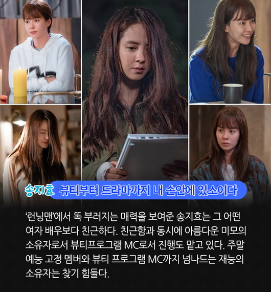 ‘런닝맨’에서 똑 부러지는 매력을 보여준 송지효는 그 어떤 여자 배우보다 친근하다. 친근함과 동시에 아름다운 미모의 소유자로서 뷰티프로그램 MC로서 진행도 맡고 있다. 주말 예능 고정 멤버와 뷰티 프로그램 MC까지 넘나드는 재능의 소유자는 찾기 힘들다.
