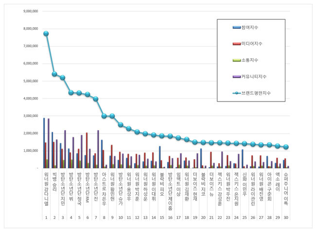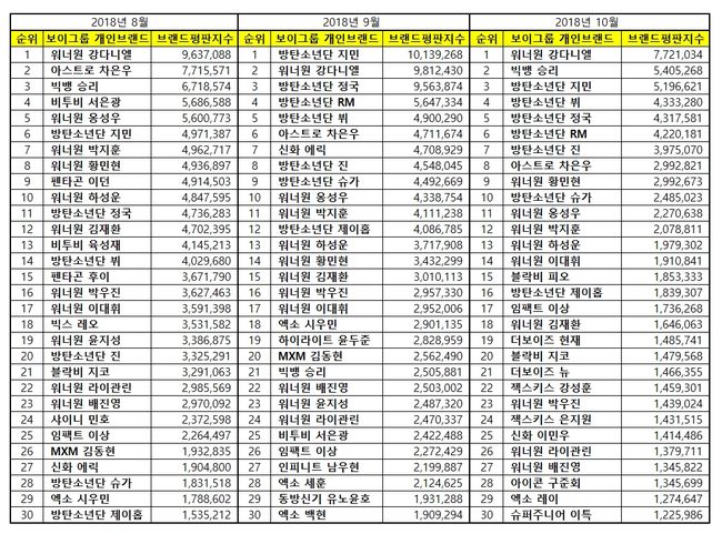 2018년 10월 보이그룹 개인 브랜드평판 30위 순위는 워너원 강다니엘, 빅뱅 승리, 방탄소년단 지민, 방탄소년단 뷔, 방탄소년단 정국, 방탄소년단 RM, 방탄소년단 진, 아스트로 차은우, 워너원 황민현, 방탄소년단 슈가, 워너원 옹성우, 워너원 박지훈, 워너원 하성운, 워너원 이대휘, 블락비 피오, 방탄소년단 제이홉, 임팩트 이상, 워너원 김재환, 더보이즈 현재, 블락비 지코, 더보이즈 뉴, 젝스키스 강성훈, 워너원 박우진, 젝스키스 은지원, 신화 이민우, 워너원 라이관린, 워너원 배진영, 아이콘 구준회, 엑소 레이, 슈퍼주니어 이특 순으로 분석되었다.